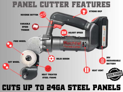 The Wachtel Panel Cutter is a battery-powered handheld solution perfect for cutting sheet metal, metal roofing, and metal lath. Cut precisely and safely with our variable speed design without the hazard of metal shavings or sharp edges.
